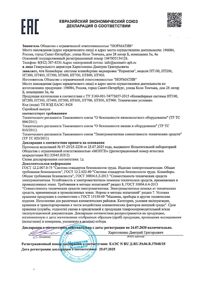 Декларация о соответствии ООО "Норматив" техническим регламентам Евразийского Экономического Союза
